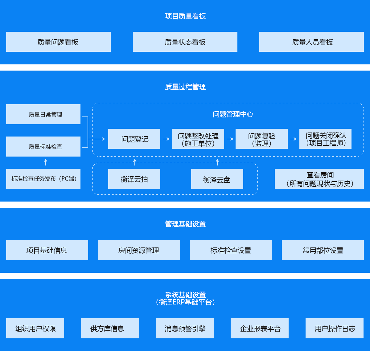 《衡澤ERP-工程管理系列》產(chǎn)品線通過領先的移動互聯(lián)網(wǎng)技術,讓地產(chǎn)工程建造環(huán)節(jié)的各類業(yè)務場景在線化,支持土建、初裝、精裝修等項目各階段的移動計劃管理、移動質量檢查。